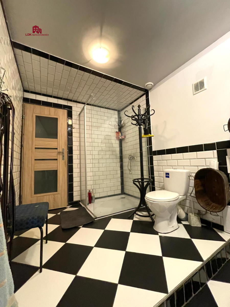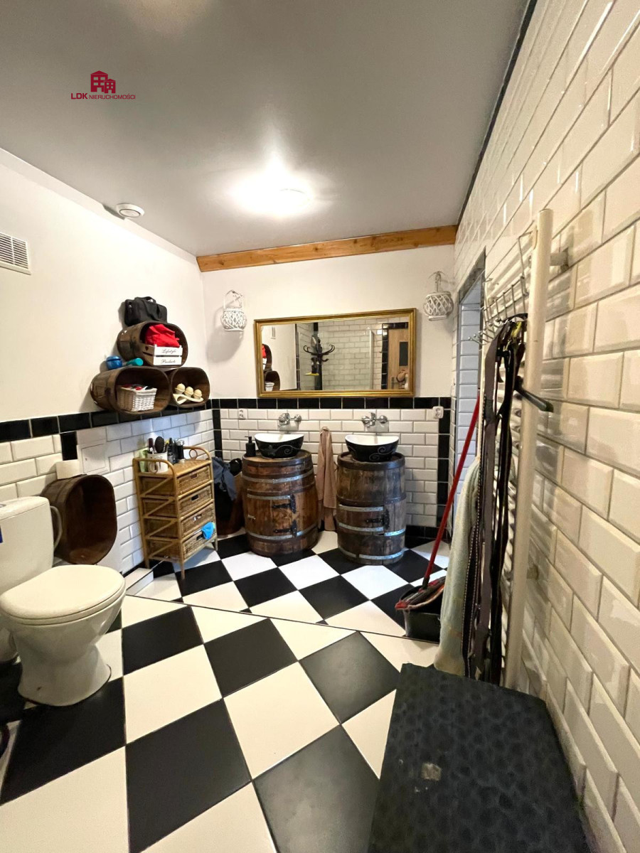 Parter: przestronny salon w stylu rustykalno-loftowym (cegła, belki, naturalne drewno), oddzielna kuchnia, łazienka z oryginalną aranżacją (beczki jako szafki pod umywalki), kotłownia, garaż w bryle budynku oraz przytulny taras przy wejściu. W salonie możliwość montażu kominka na drewno.